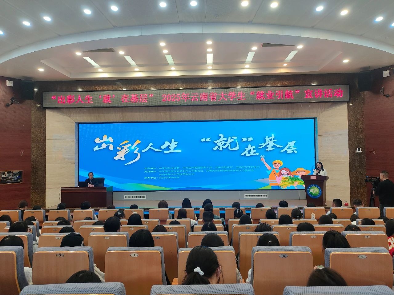 4月10日,由共青团云南省委、中共云南省委教育工委、云南省教育厅、云南省学生联合会共同主办的“出彩人生 ‘就’在基层”——2025年云南省大学生“就业引航”宣讲活动在翰墨楼一楼报告厅举行。本次活动采取“线下+线上”联动模式,全省学生通过现场参与和线上直播形式参与此次活动。活动观看总数达6.5余万人。