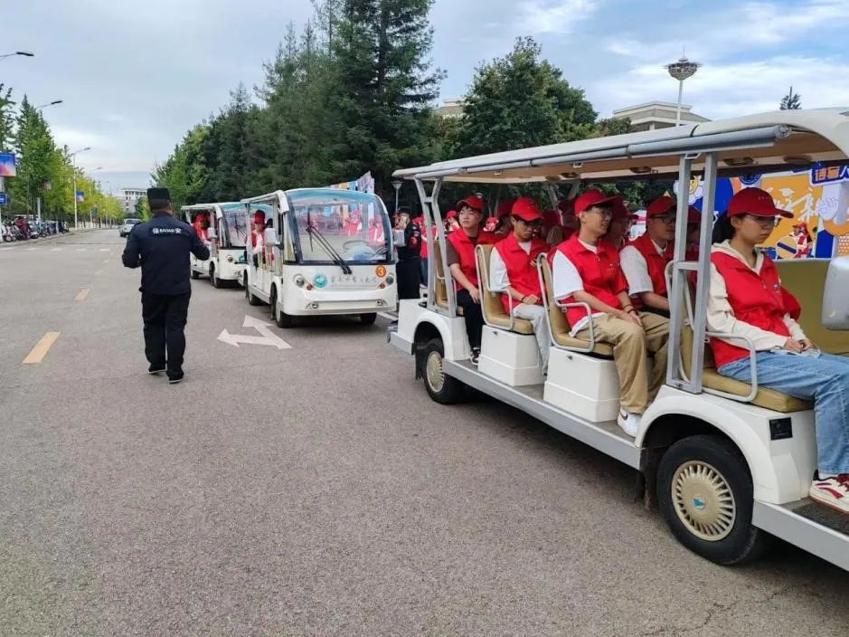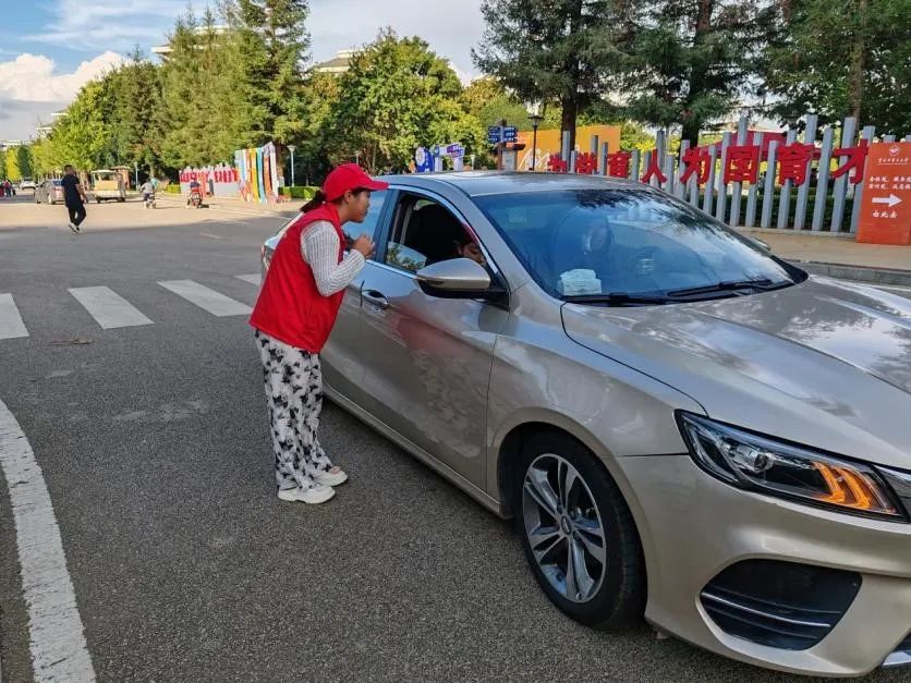 志愿者坐上开往各个点位的车,他们今天是云中的安全小卫士,为云中学子保驾护航。