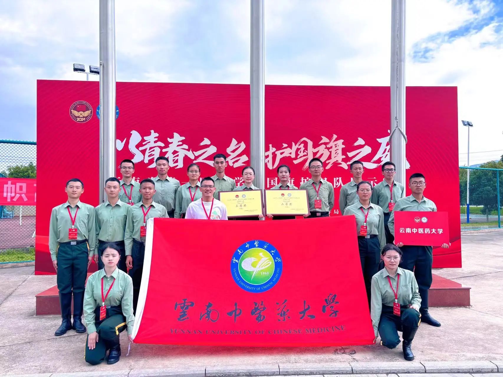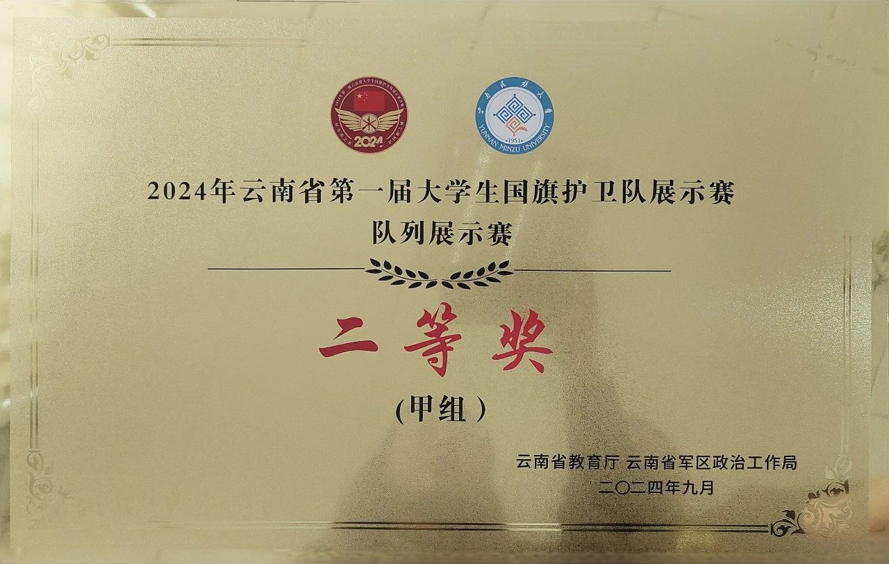 9月18—22日,由云南省教育厅、云南省军区政治工作局主办的云南省第一届大学生国旗护卫队展示赛决赛在云南民族大学呈贡校区举行,经过激烈角逐,我校国旗护卫队荣获甲组(本科组)队列展示赛二等奖,甲组(本科组)升旗展示赛三等奖。