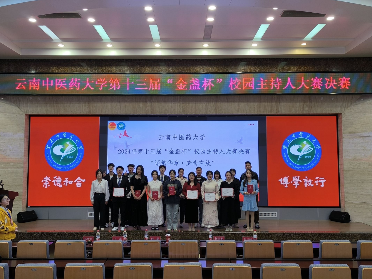 由校学生会、信息学院学生会共同承办的“语韵华章·梦为声放”云南中医药大学2024年“金盏杯”校园主持人大赛决赛于12月10日18:30在翰墨楼一楼报告厅举行。中药学院团委、第一临床医学院团委、第二临床医学院团委、校团委等相关人员担任比赛评委,300余名学生现场观看比赛。