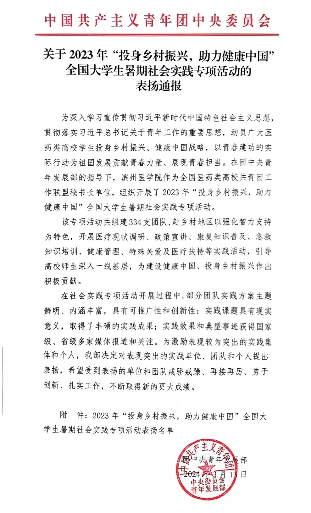 在团省委、学校党委的领导下,校团委组织开展了2023年“投身乡村振兴,助力健康中国”大学生暑期“三下乡”社会实践活动。通过学校申报、审核推荐、组织评议等环节,近日校团委被共青团中央授予2023年“投身乡村振兴,助力健康中国”全国大学生暑期社会实践专项活动“表现突出单位”;研究生会主席团成员马玉珊获“表现突出个人”称号。