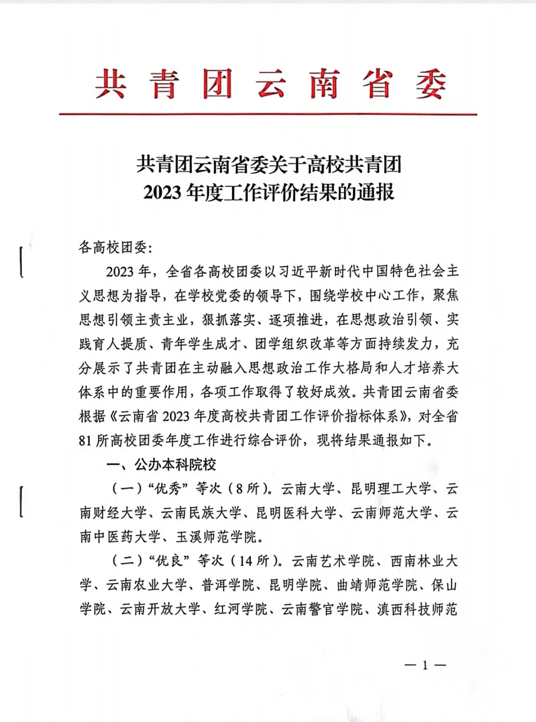 近日,共青团云南省委通报了全省高校共青团2023年度工作考核评价结果,我校共青团工作在考核评价中获“优秀”等次。