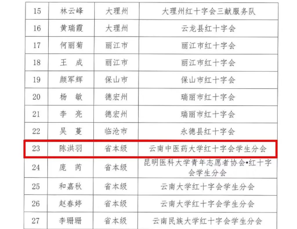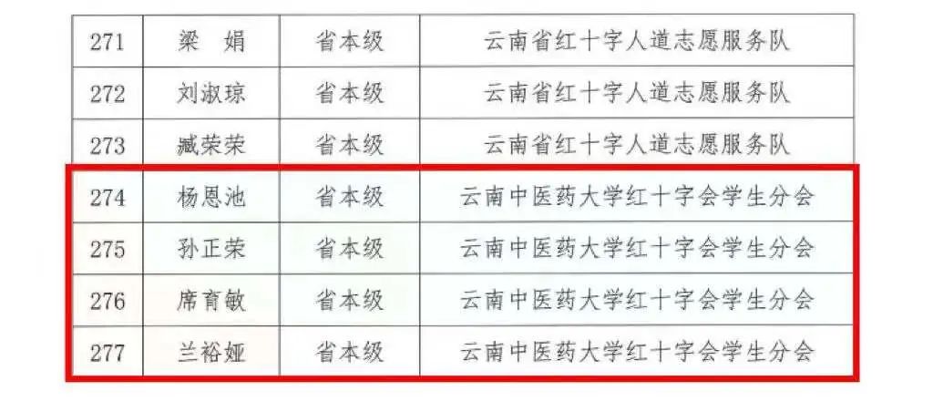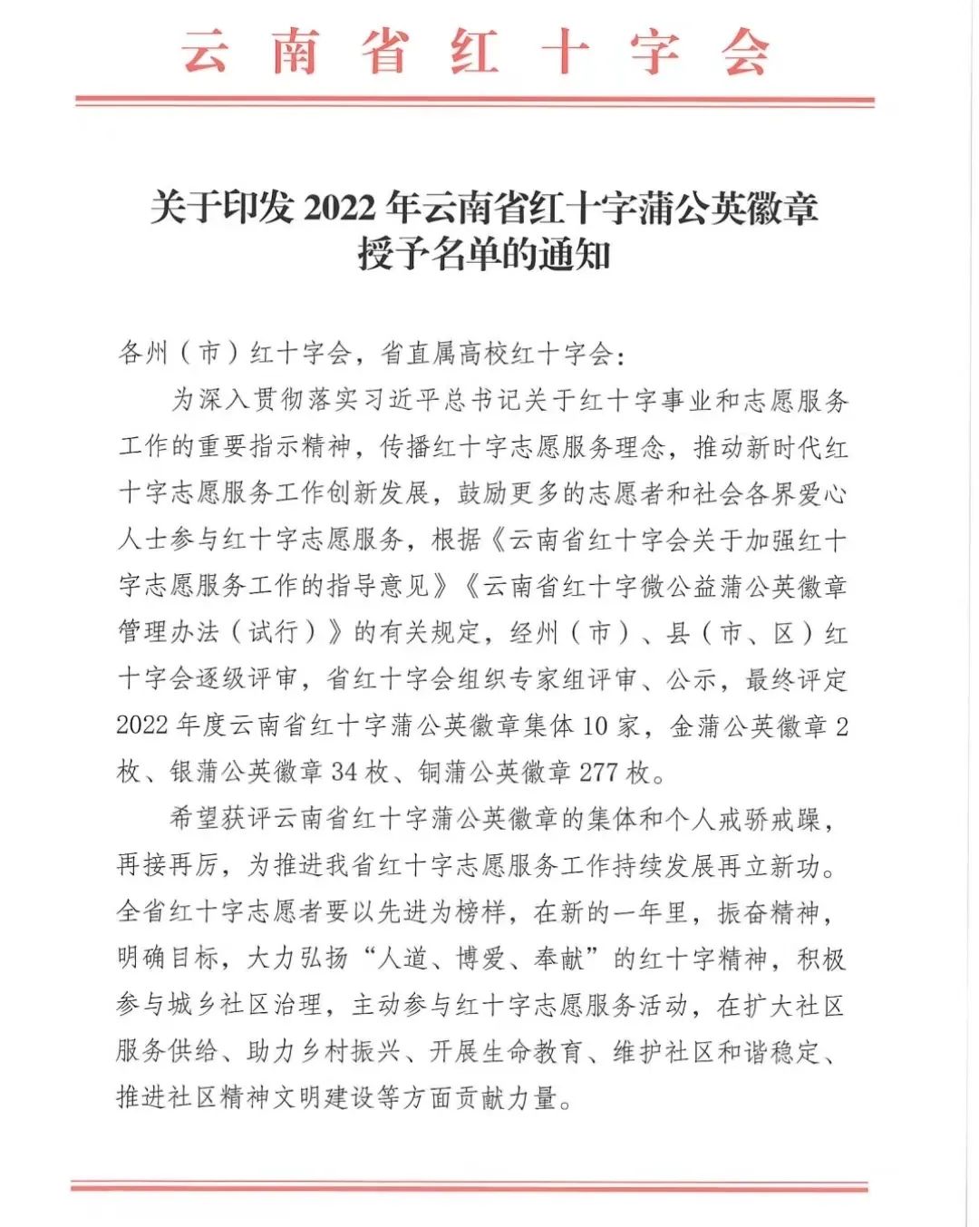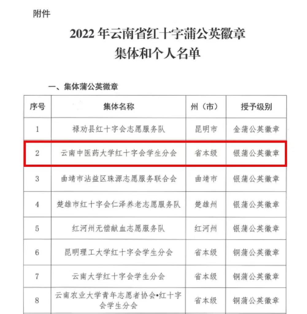 根据《云南省红十字会关于加强红十字志愿服务工作的指导意见》《云南省红十字微公益蒲公英徽章管理办法(试行)》的有关规定,经各级红十字会的逐级评审,省红十字会终审、公示,校团委获2022年度集体蒲公英徽章;第一临床医学院陈洪羽获个人银蒲公英徽章,中药学院杨恩池、第一临床医学院孙正荣、第二临床医学院席育敏、第二临床医学院兰裕娅4名同学获个人铜蒲公英徽章。