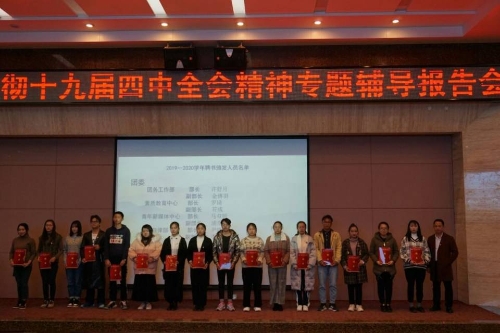 云中团讯【通讯稿 邵晓丹】2019年12月24日18:30,学习贯彻十九届四中全会精神专题辅导报告会在云南中医药大学翰墨楼一楼报告厅成功举办。出席人员有校团委副书记浦仕通老师,全体校团委、校学生会学生干部。