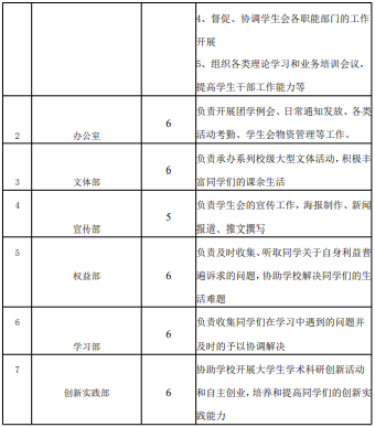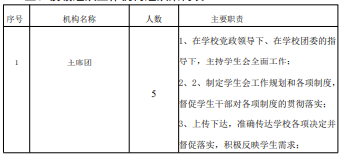 第十九条 学生会组织架构一般为“主席团+工作部门”模式。学生会的组织不应重叠与复杂,要优化机构和人员规模。除学生会主席团成员和工作部门成员均不设置其他任何职务。校级学生会工作人员一般为40人左右,工作部门一般不超过6个,主席团成员不超过5人,每个工作部门成员设负责人2至3人,工作人员一般不超过6个。学院学生会工作人员一般为20至30人,主席团成员不超过3人。
