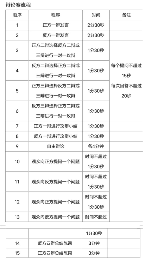 2.复赛辩题由主办方提供(部分辩题将面向全校征集),参赛选手于赛前两天于校学生会办公室(佩衡馆310)进行抽签决定出场顺序、辩题及辩论赛正反方。复赛采取淘汰制,按得分由高到低进行排序,排名前四的队伍晋级决赛。