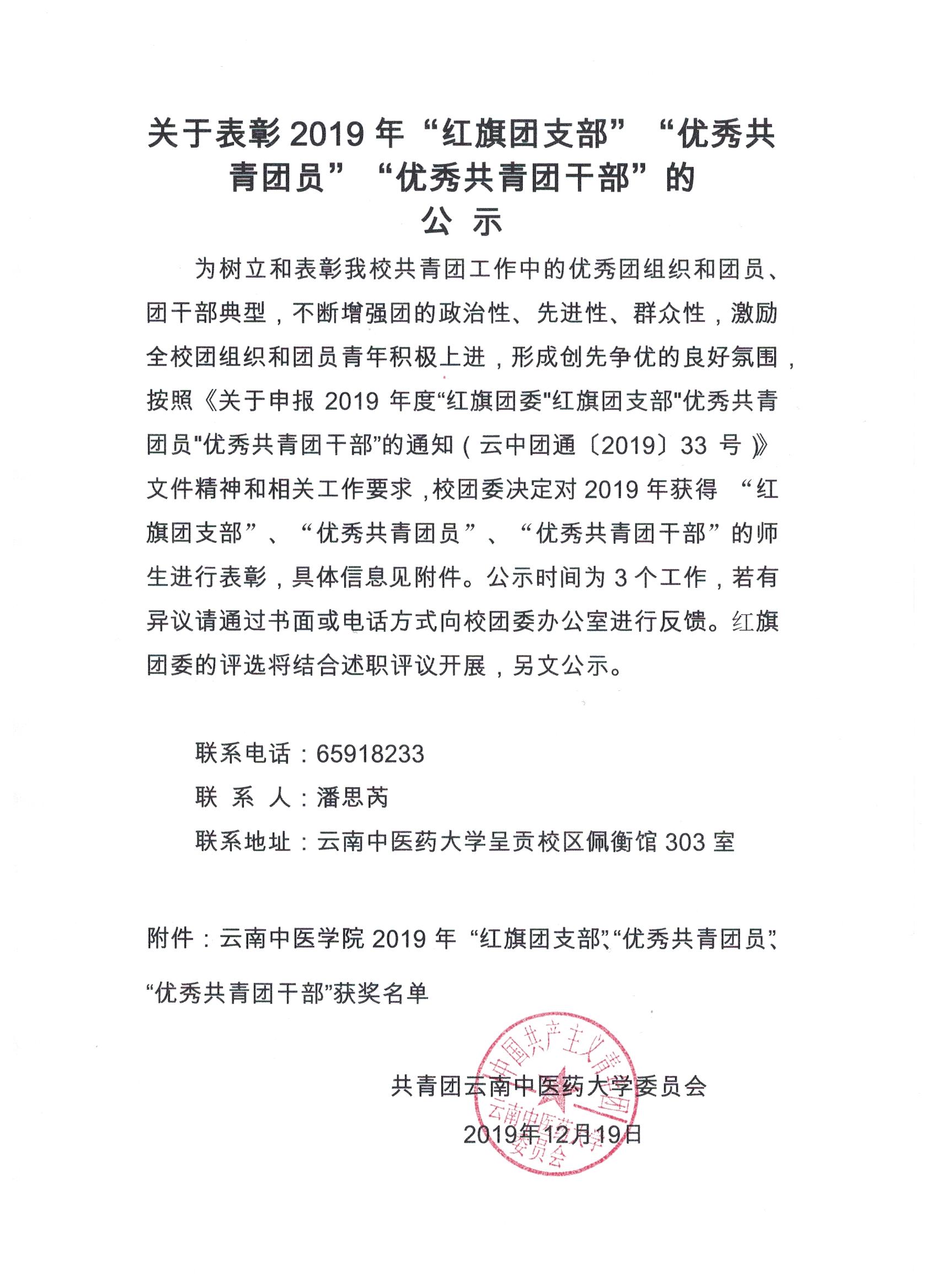 云南中医药大学2019年“红旗团支部”“优秀共青团员”“优秀共青团干部”获奖名单