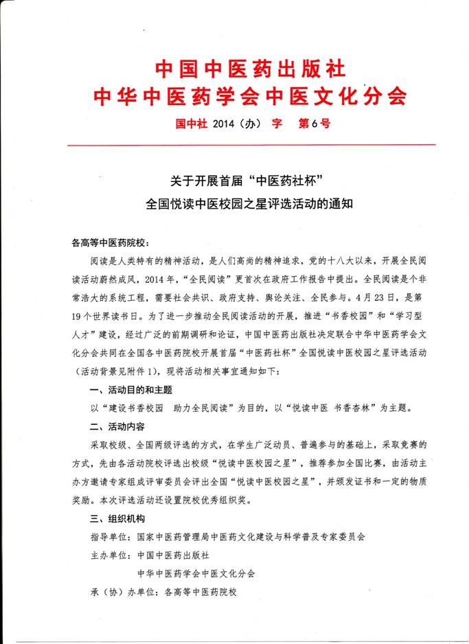 为了进一步推动全民阅读活动的开展,推进“书香校园”和“学习型人才”建设,中国中医药出版社联合中华中医药学会文化分会共同在全国各中医药院校开展首届“中医药社杯”全国悦读中医校园之星评选活动。经报分管校领导同意,团委、图书馆、学工部、教务处联合开展此次评选活动,现将相关事宜通知如下: