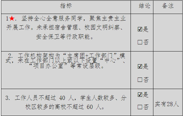 1. 坚持全心全意服务同学,聚焦主责主业开展工作。未承担宿舍管理、校园文明纠察安全保卫等行政职能。