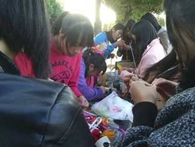 我校学生通过制作各种形式的手工艺品,挖掘学生才艺、潜力,帮助同学们发现自己的闪光点。展览活动分三个环节:展品展示与说明、现场制作与传授、赠送手工艺品。展览品琳琅满目、形式各样:手链、桃心、小荷包、鱼、虾、风筝、蝴蝶、帽子、中国结等编织品;有玫瑰,百合,郁金香等形状的丝网花。
