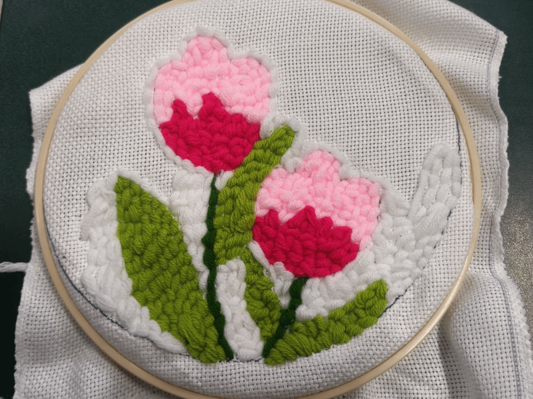活动概况:活动于启思楼2106教室开展,将戳戳绣工艺与花卉美学相结合,让参与者掌握其基础技法,完成专属花卉主题作品。同学们在沉浸式创作中舒缓情绪、找回内心专注与宁静,于一针一线间体会温暖与治愈。