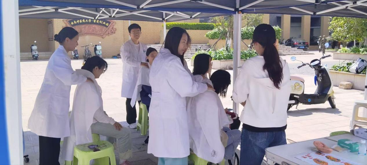 近日,针灸推拿协会在校举办了为期三天的“岐黄施仁术,杏林贺国庆”义诊活动。活动上表演了功夫扇、八段锦、易筋经等传统节目。社团成员为老师、同学们以及校园后勤人员提供了推拿、脉诊和耳穴埋籽等服务,并向广大师生普及中医药知识,分享实用的推拿技巧,赢得了参与者的广泛赞誉。