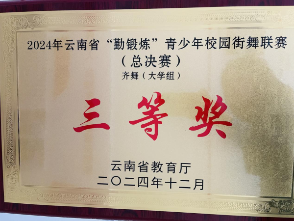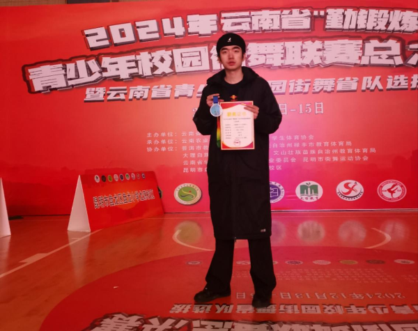 12月14日,我校选派街舞社参加由云南省教育厅主办、云南农业大学承办的2024年云南省“勤锻炼”青少年校园街舞联赛。街舞社选送齐舞《BUM BUM》参加团体项目,最终荣获齐舞(大学组)省级三等奖。街舞社成员刘卓识同学在震感舞大学组1v1比赛中获省级亚军。