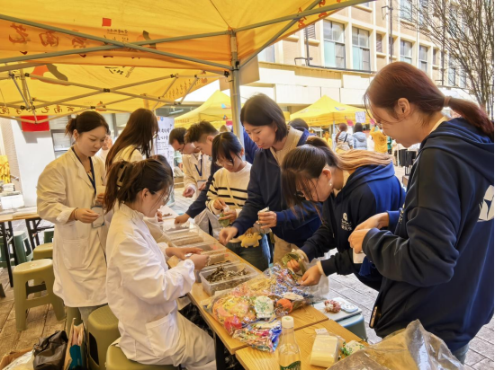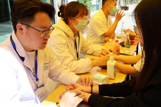 现场师生咨询个性化中医调理方案,观摩学习八段锦,体验中医脉诊、针灸、推拿、耳穴及中药香囊制作,沉浸式感受中医药的神奇功效。