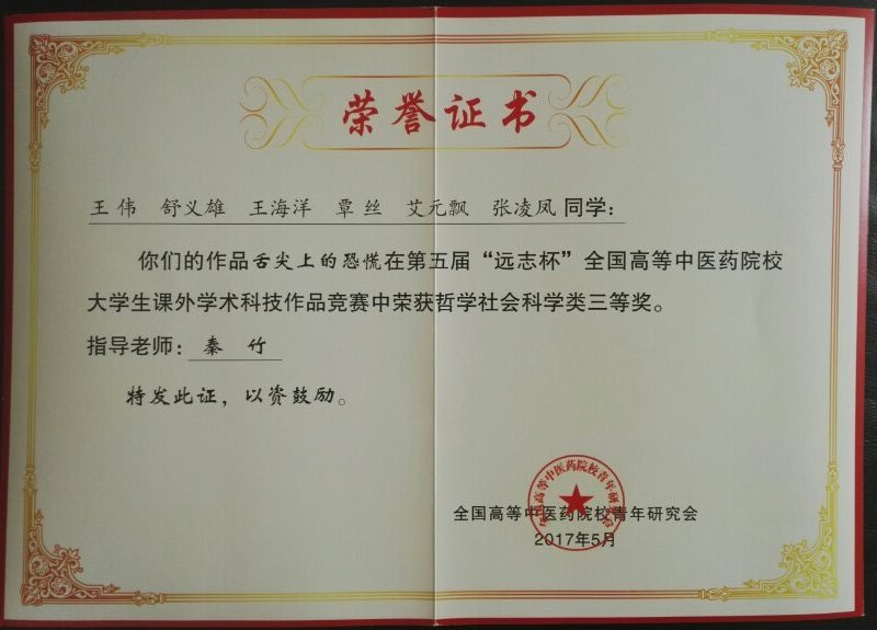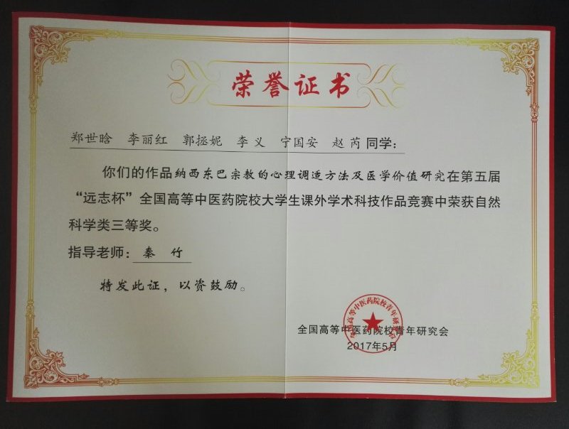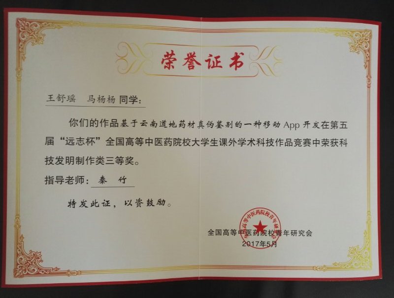 其中由我校郑世晗、李丽红、郭拯妮、李义、宁国安、赵芮团队申报的作品名称:《纳西东巴宗教的心理调适方法及医学价值研究》获得“自然科学类”三等奖。由王伟、舒义雄、王海洋、覃丝、艾元飘、张凌风团队申报的作品名称:《舌尖上的恐慌》获得“哲学社会科学类”三等奖。由王舒瑶、马杨杨团队申报的作品名称:《基于云南道地药材真伪鉴别的一种移动App开发》获得“科技发明制作类”三等奖。同时,我校张雅琼老师、徐静同学荣获全国优秀青年称号。